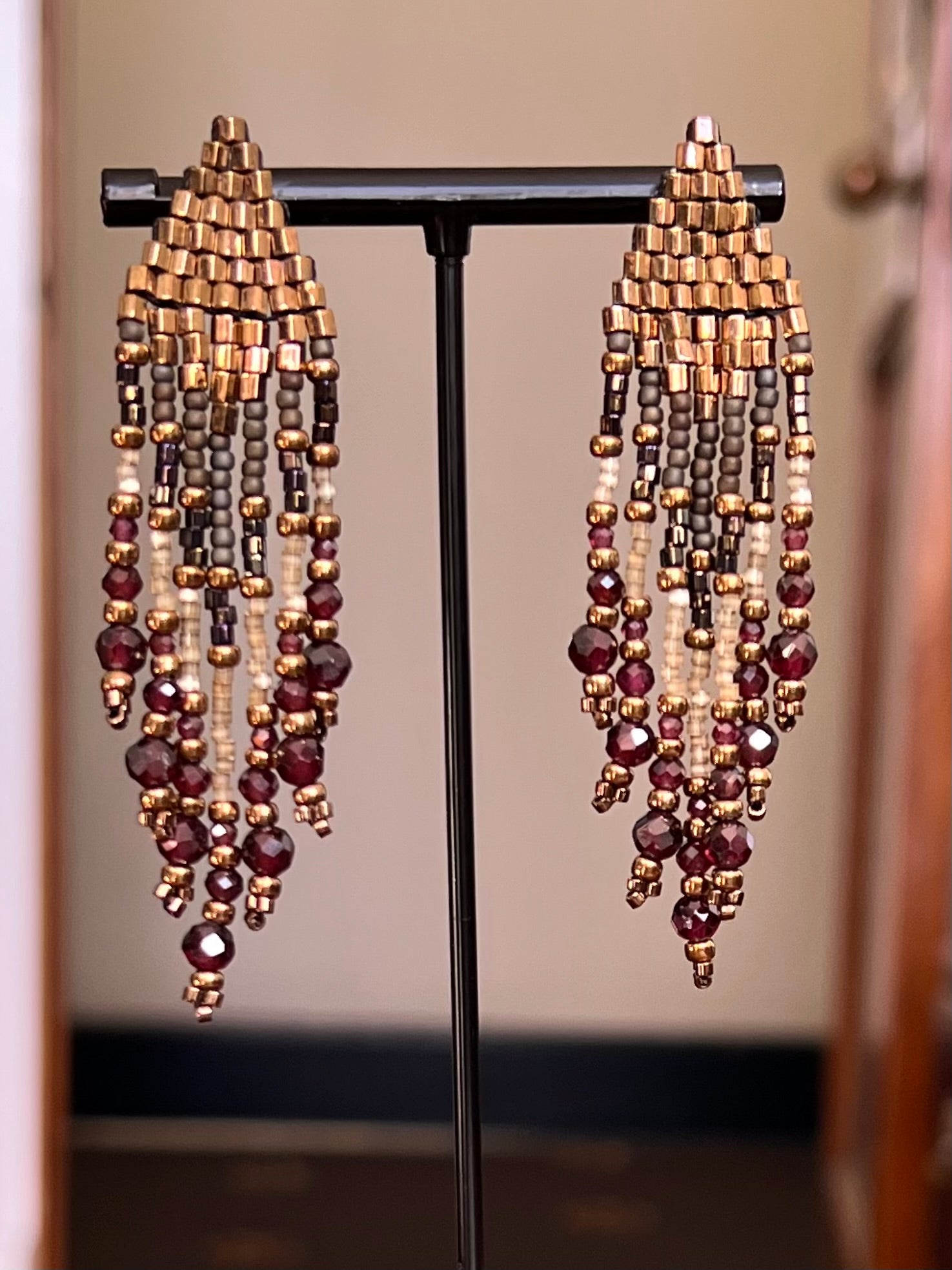 These lovely Garnet Tassel Earrings are 18cm long & 2cm wide. Hand woven with a delicious textured mix of Japanese Delica & Toho beads with faceted garnet in the tassels. They sit on the lobe with sterling silver post & butterfly.
