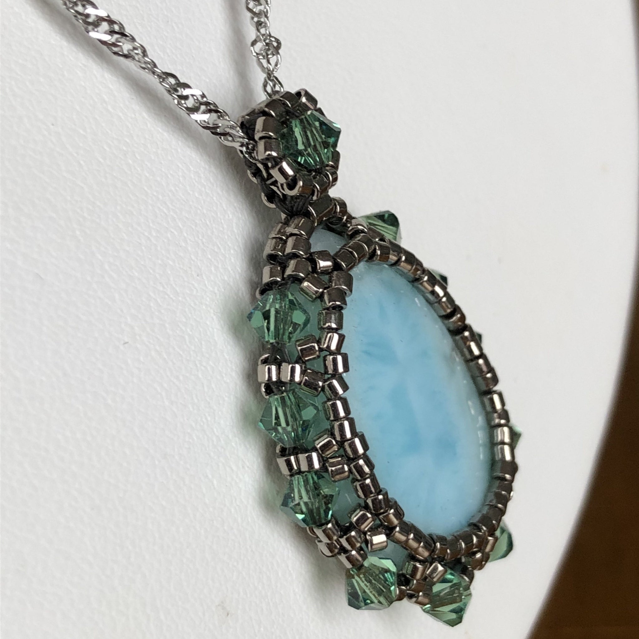 This beautiful stone reflects an icy blue pool. It is set in metallic silver-tone beads and framed by dusky blue Austrian crystal.