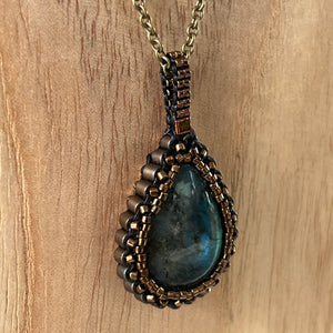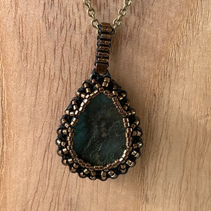 This stone has a beautiful teal glow with some earthy golden inclusions, and is framed by a weave of metallic bronze shiny and matte Delica beads. The framing process is done by hand with skill and precision, using slow-fashion techniques of weaving glass micro-beads, one bead at a time, and securely fastened without the use of glue.
